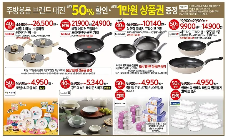 유명 브랜드 프라이팬과 궁중팬, 밀폐용기 할인이 많습니다. 또한 홈플러스 단독 할인 행사도 있으니 품목을 확인하시길 바랍니다. 주방용품 구매시 최대 50% 할인과 최대 1만원 상품권까지 증정해드리고 있습니다.